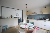 - au rez-de-chaussée : une entrée, une cuisine aménagée (éléments hauts et bas) et équipée (hotte, four, plaque), un dégagement, un salon-séjour, un salle d'eau avec wc.