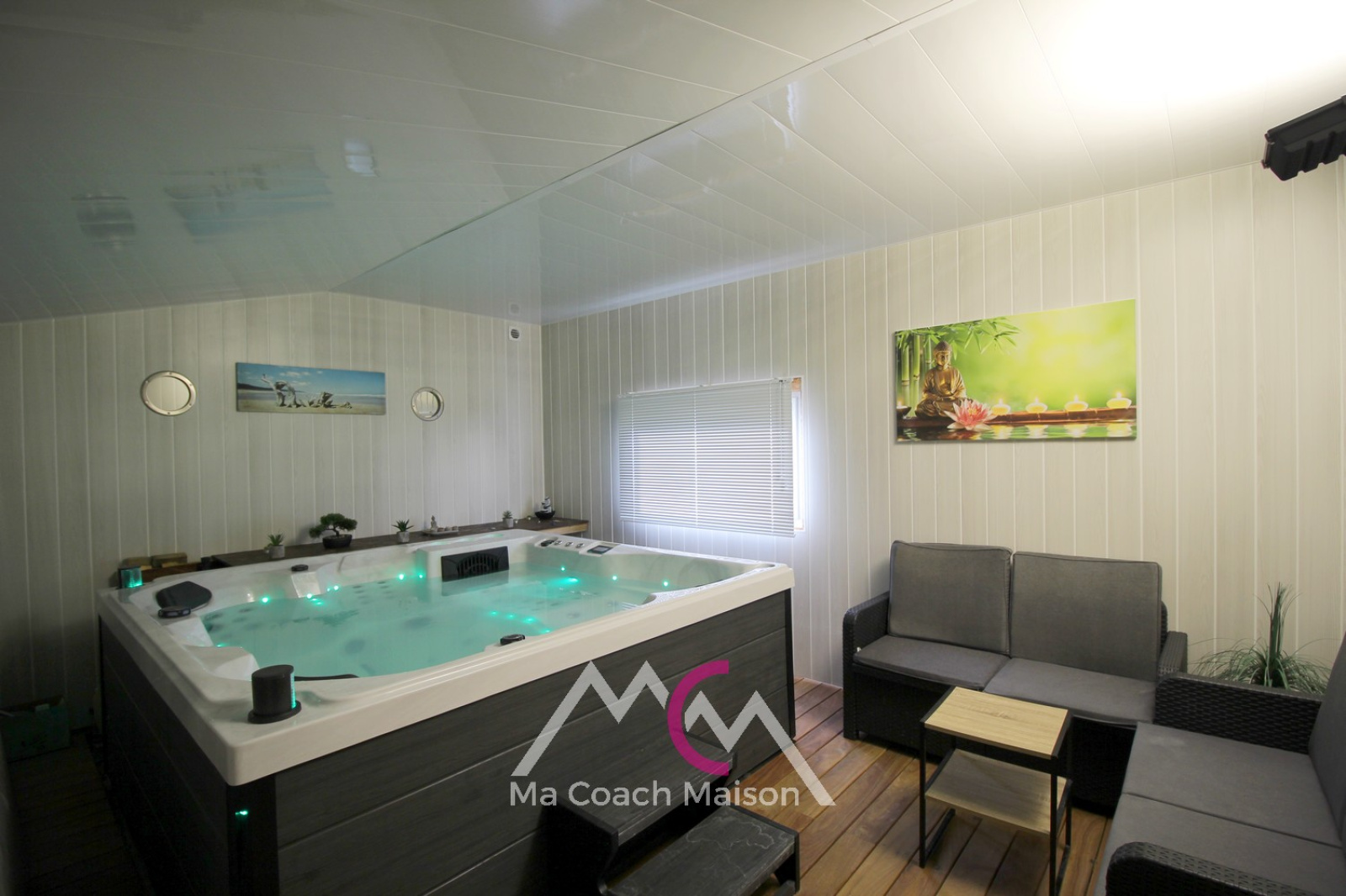 Sur l'arrière, une dépendance en bois offre un bel espace détente avec une partie jaccuzzi pour 6 personnes et un espace douche.
