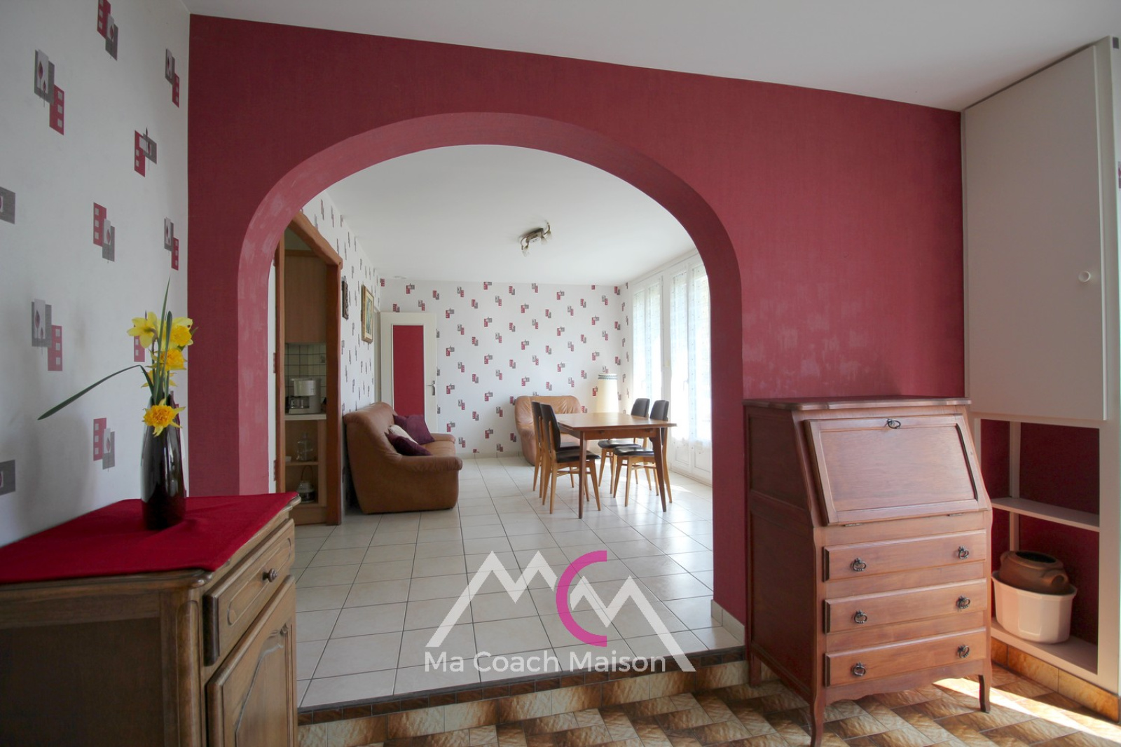 La maison dispose d'un agencement fonctionnel avec une entrée desservant un salon-séjour et une cuisine aménagée ouverte, et un espace nuit comprenant 3 chambres, une salle d'eau et un wc.
